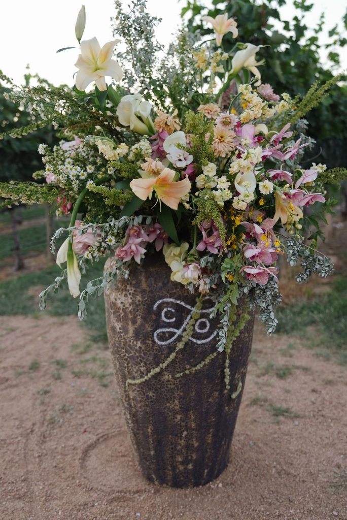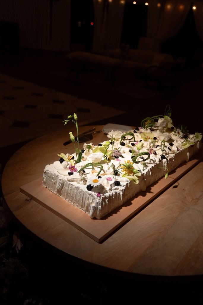 The atmosphere was brought to life with music by Dart Collective, while Loot Rentals created an inviting lounge space that perfectly complemented the relaxed, romantic aesthetic. The couple made their grand entrance hand-in-hand before cutting a one-of-a-kind, flower-topped cake that looked as much like art as dessert.
