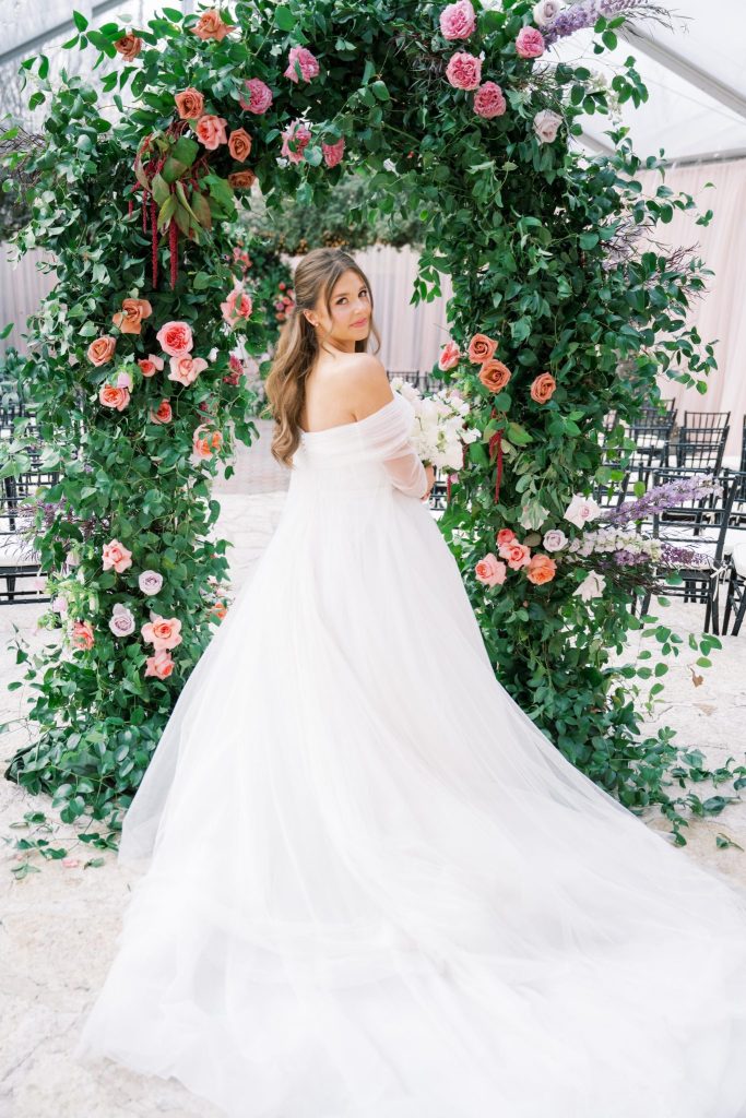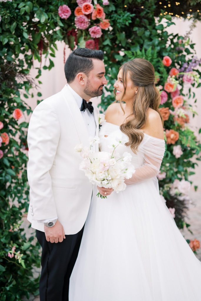 “It’s so hard to pick just one favorite memory because the day was filled with so many special moments. One that stands out was arriving at the venue while everything was still being set up. Seeing months of planning and my vision come to life was surreal. I was just giddy over the details. I love the little things, so getting to walk in and see everything come together exactly how I pictured it was magical. I can still remember the smell of all the gorgeous florals filling the air, especially around the arches. But my favorite moment of all was our first look. We did it as a quiet little ceremony with me walking down the aisle just like I would later in front of our guests. It felt like our own private moment, just the two of us. We really value that kind of intimacy. We even got engaged in a quiet spot on a quaint little street by the water in Old Town Alexandria, just the two of us.”