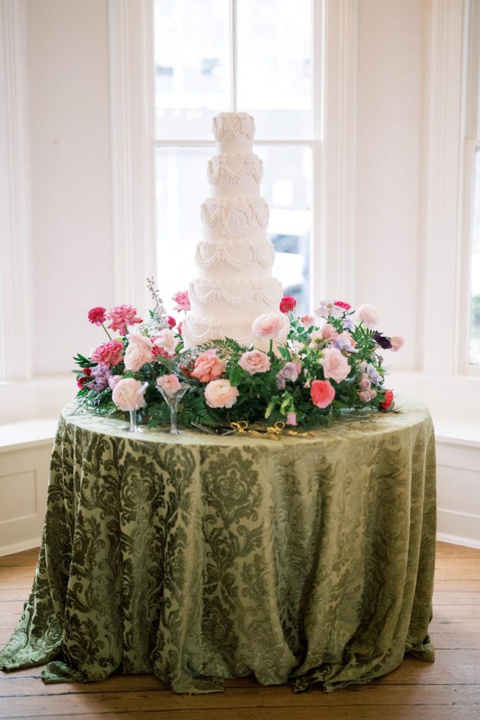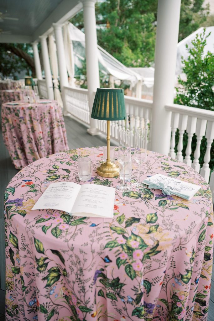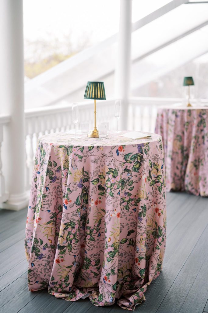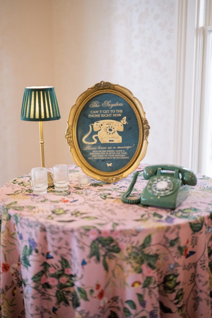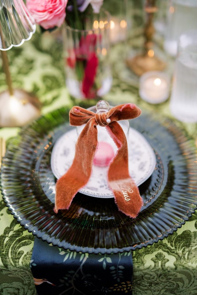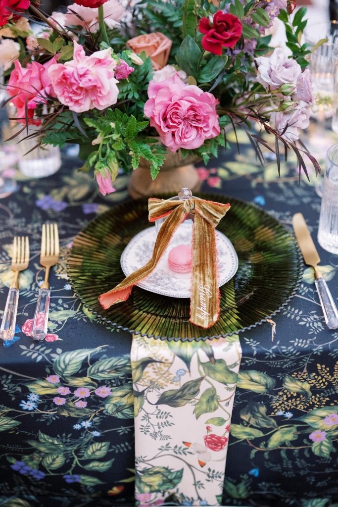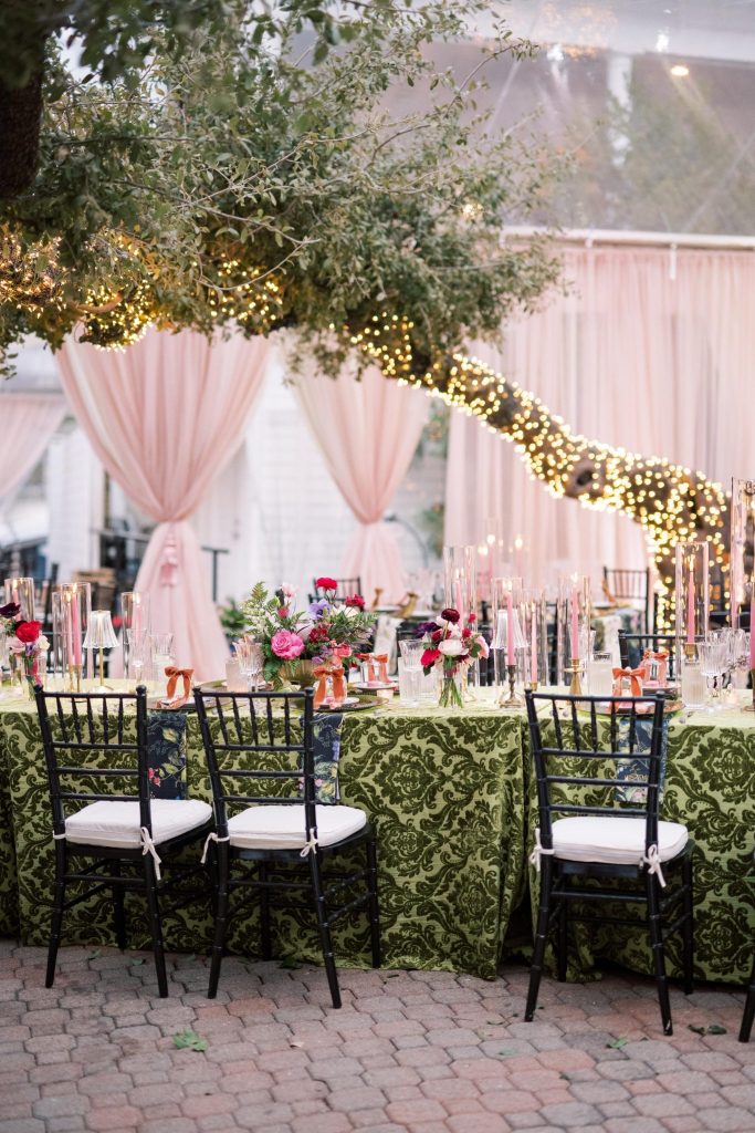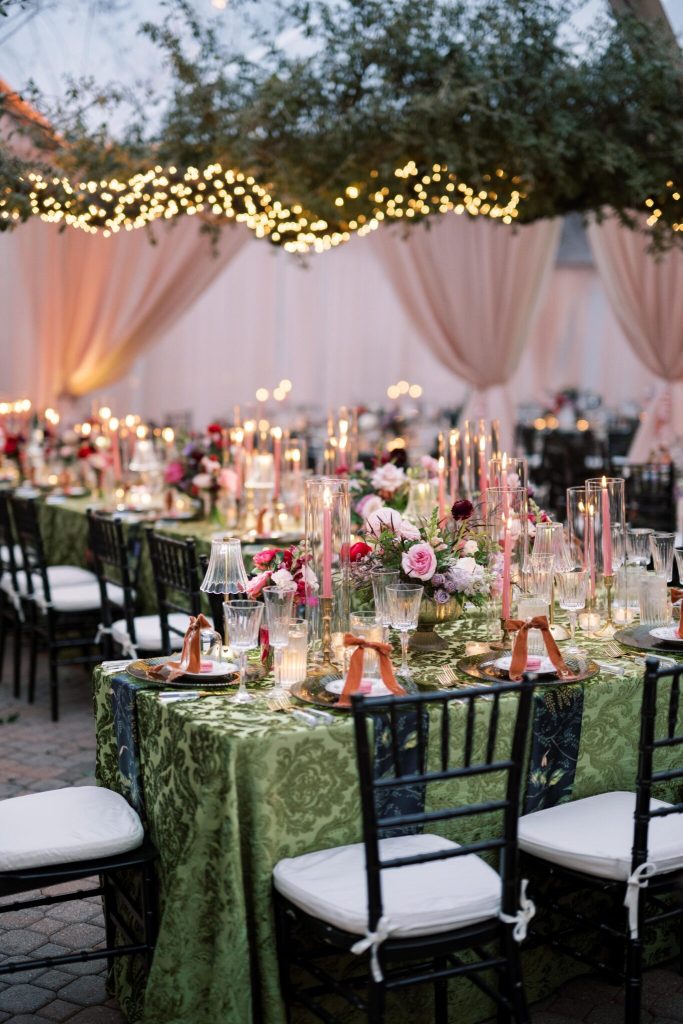 When it was time to celebrate, the reception carried the same spirit of romance and whimsy. Guests were welcomed into a warm and inviting space filled with twinkling lights and glowing candles. Tablescapes dressed in richly patterned green linens were paired with abundant florals and thoughtful place settings, creating a look that was both bold and refined. SoHo Event Co. delighted guests with a dining experience as memorable as the décor itself.