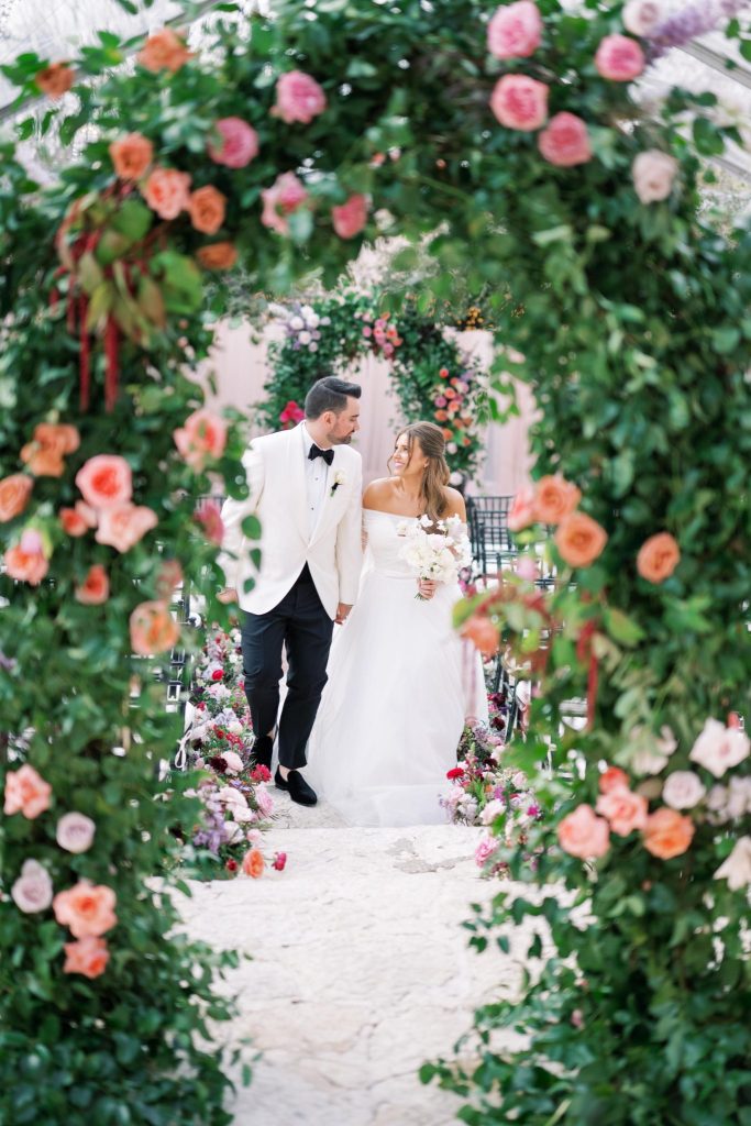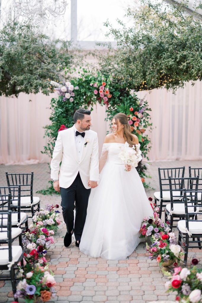 This month, we’re spotlighting Paityn and Matthew’s vibrant garden-inspired wedding. Their January 25, 2025 celebration was the perfect blend of elegance and fun. From their custom signature cocktails displayed in a vintage frame, to bold floral centerpieces bursting with color, every detail felt intentional and full of personality. Guests were welcomed by patterned linens and playful textures, while the couple exchanged vows in front of a lush floral arch that looked straight out of a fairytale.