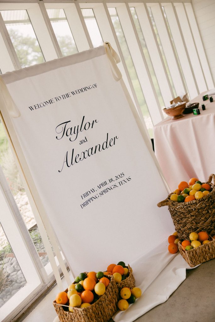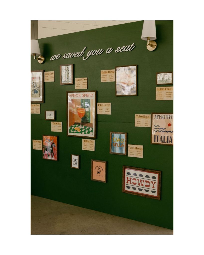 As guests arrived, they were welcomed by a vibrant green seating chart installation that read “We saved you a seat,” paired with illustrated table assignments. This wasn’t just a logistics tool — it was an artistic statement, seamlessly styled by Rust and Relics to set the tone for the thoughtful experience that followed. Nearby, baskets of bright clementines and limes added a pop of color and a playful nod to spring, offering a sensory and symbolic start to the celebration.