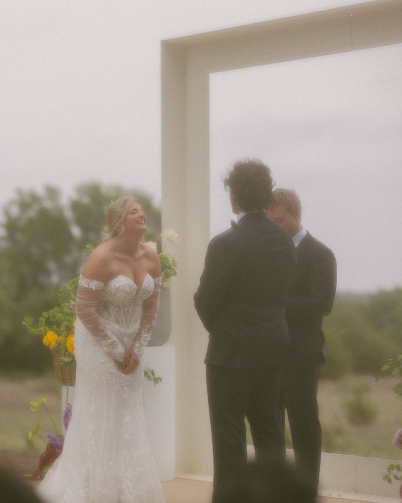 Their private vows took place under a sprawling oak tree, bathed in soft April light, creating a naturally serene setting for their most intimate moment. The ceremony space had a geometric arbor designed by Native Bloom Floral stood as a striking, organic focal point — minimalist yet artistic, perfectly framing the couple as they said “I Do”.