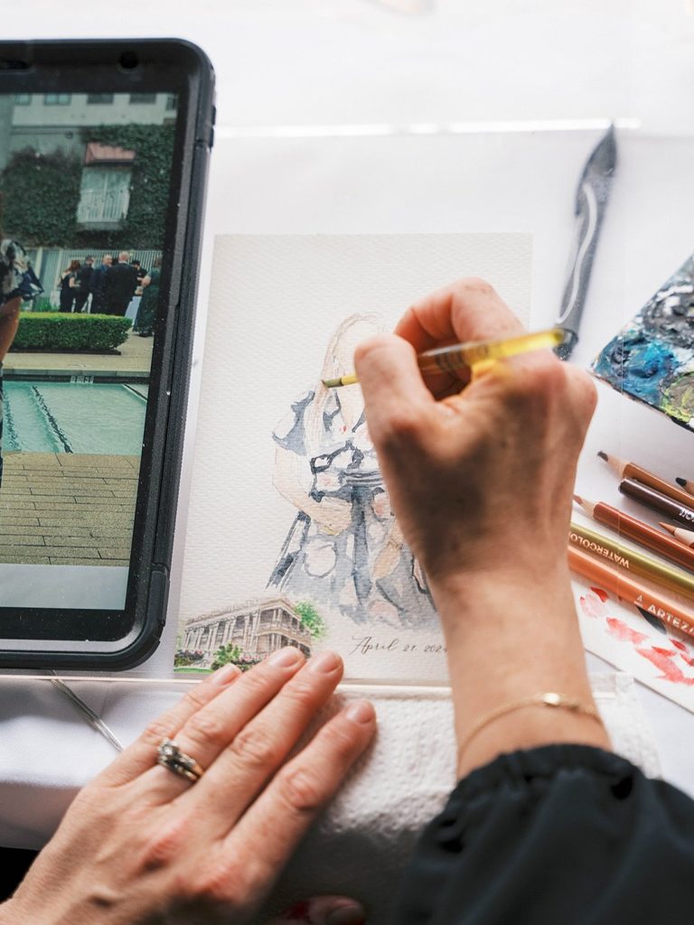 Golden Hour Live Art is a total hit at weddings! Guests love watching their portraits come to life in real-time — and they get to take home a super special keepsake that’s way better than a classic party favor. ?