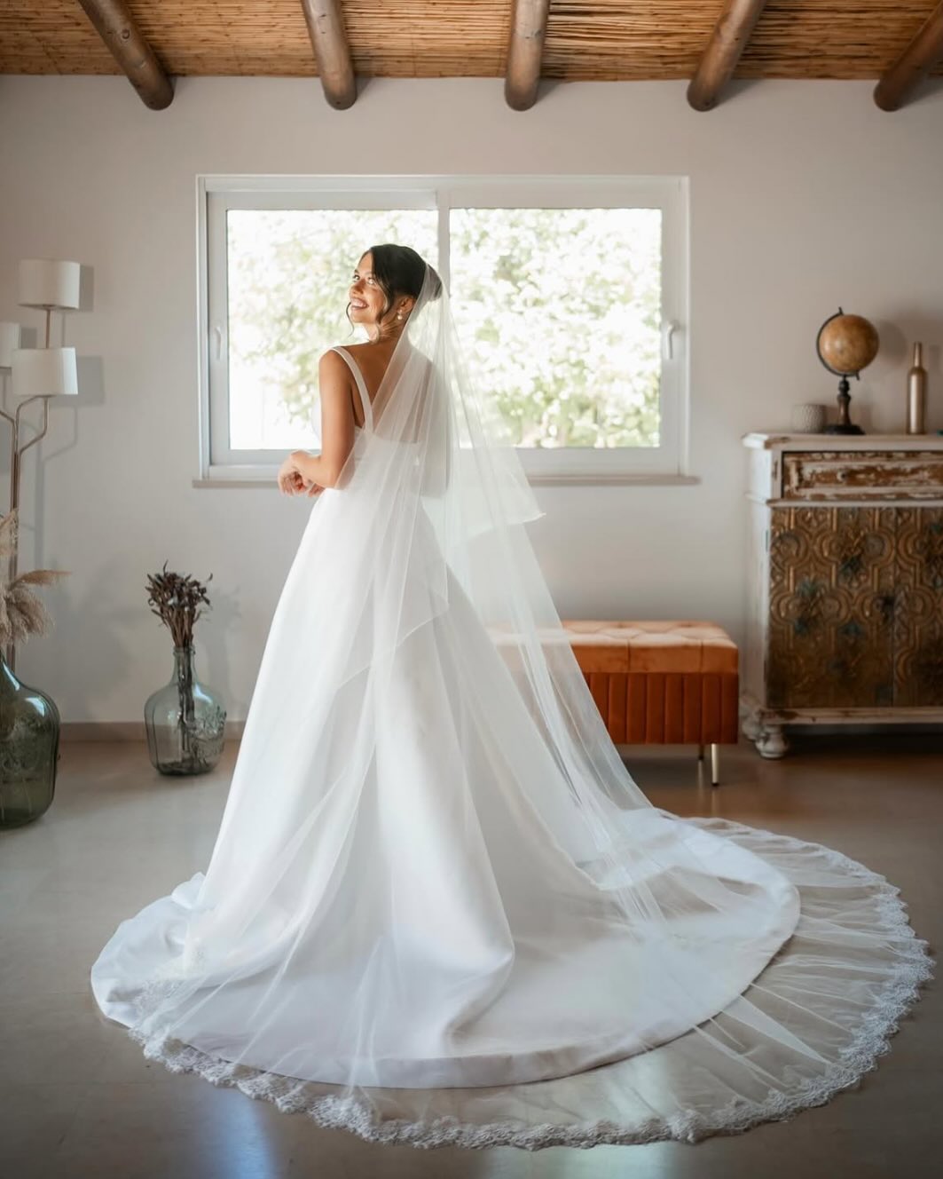 Chapel Train: a popular option, best for brides who do want a train but don’t want a ton of extra fabric weighing them down.