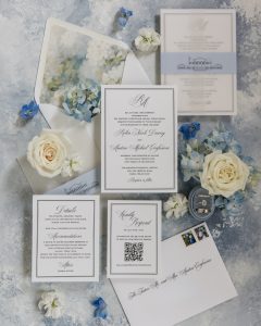 It’s important to know your wedding style ahead of time. Will it be formal or casual? Will it be modern or boho? Next, you want to know your colors. This is where it is helpful to have your wedding planner selected first because they will help you create your color scheme and mood boards to use as a guide throughout the selection process. If you will be working with a local vendor on custom or semi-custom invitations, they will also be able to help you make this selection. A wedding invitation should be a preview of what guests can expect at your wedding celebration. That’s the best guide to keep in mind as you select your wedding invitations.