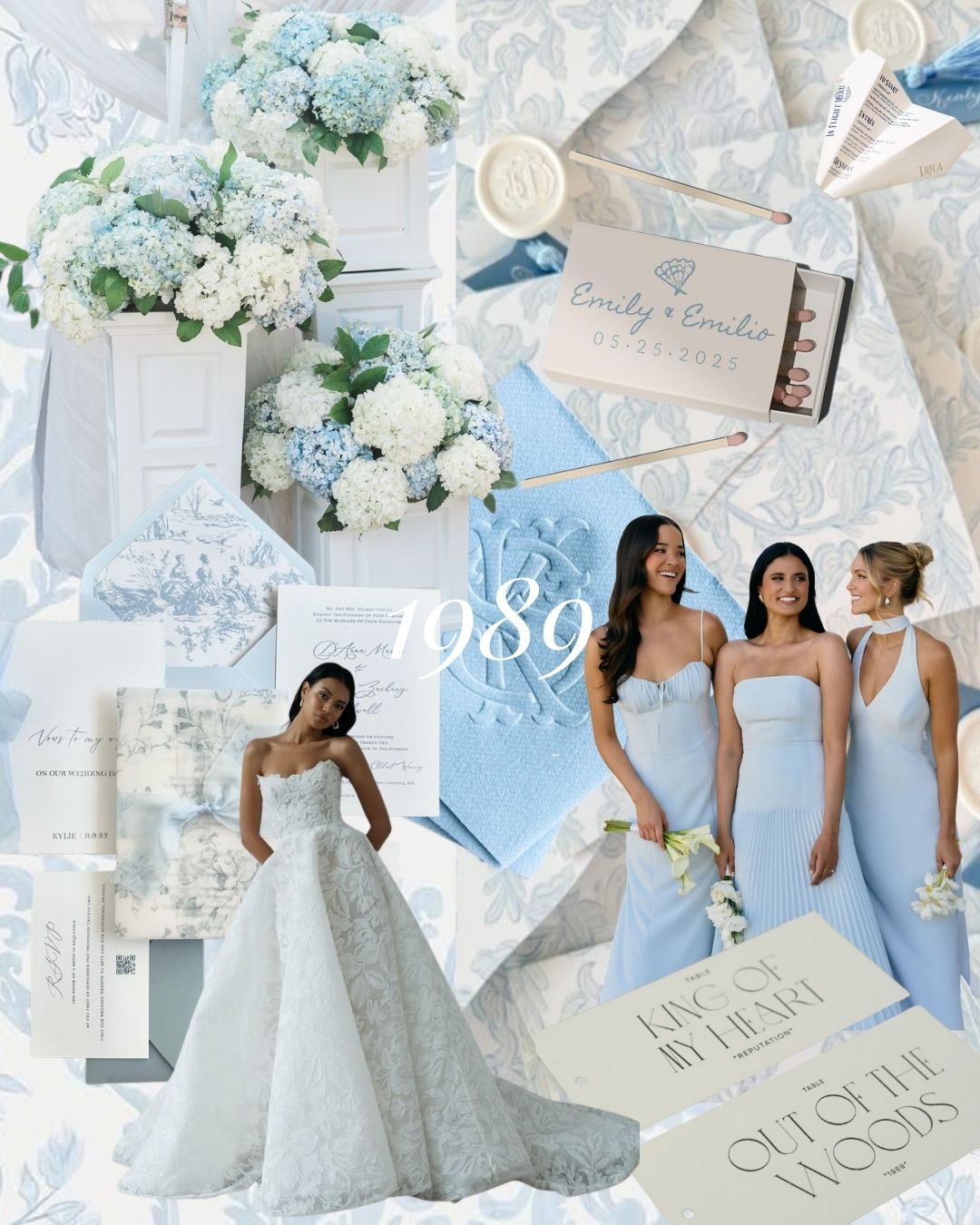 For engaged couples who want their wedding to feel effortlessly chic and modern, a “1989″ inspired theme is a dream come true. Picture a day that never goes out of “Style” in a timeless white gown surrounded by soft blue and ivory florals, with bridesmaids glowing in shades of “Clean” elegance. Invitations and details carry a crisp sophistication, while the entire day feels like stepping into your “Wildest Dreams” joyful, free-spirited, and unforgettable. With ambiance of airy blooms to the charm of delicate stationery, this theme will show your audience exactly “How You Get The Girl.”