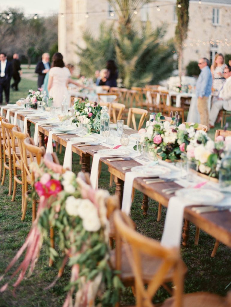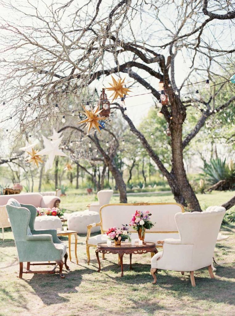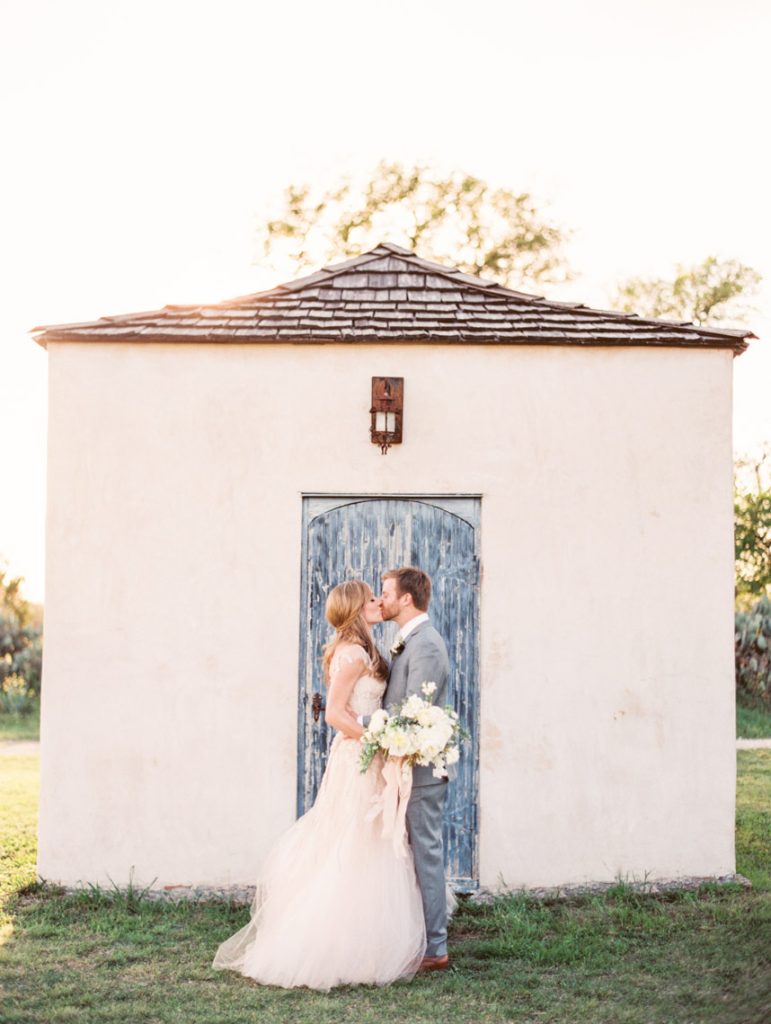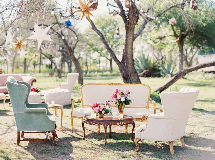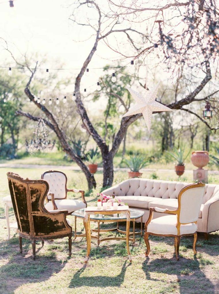 It looked just like the French countryside. Greenery and blush pink peonies crowned chairs and doorways. Stone ledges and charming blue-doored garden cottages set along on the sprawling property. The magnificent stone mansion overlooked the lawn filled with guests mingling on their way to wooden chairs facing wide-open spaces. Gold and cream stars cascaded from tree branches over cream-colored vintage couches and sky blue chairs. Sheer white fabric dressed long wooden tables with wooden chairs and lights strung above. It was a festive garden party nestled in the heart of central Texas, and there was a beautiful wedding that was about to transpire.