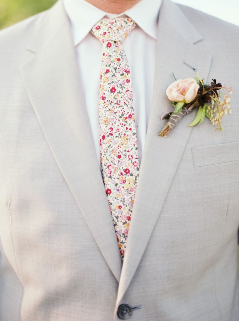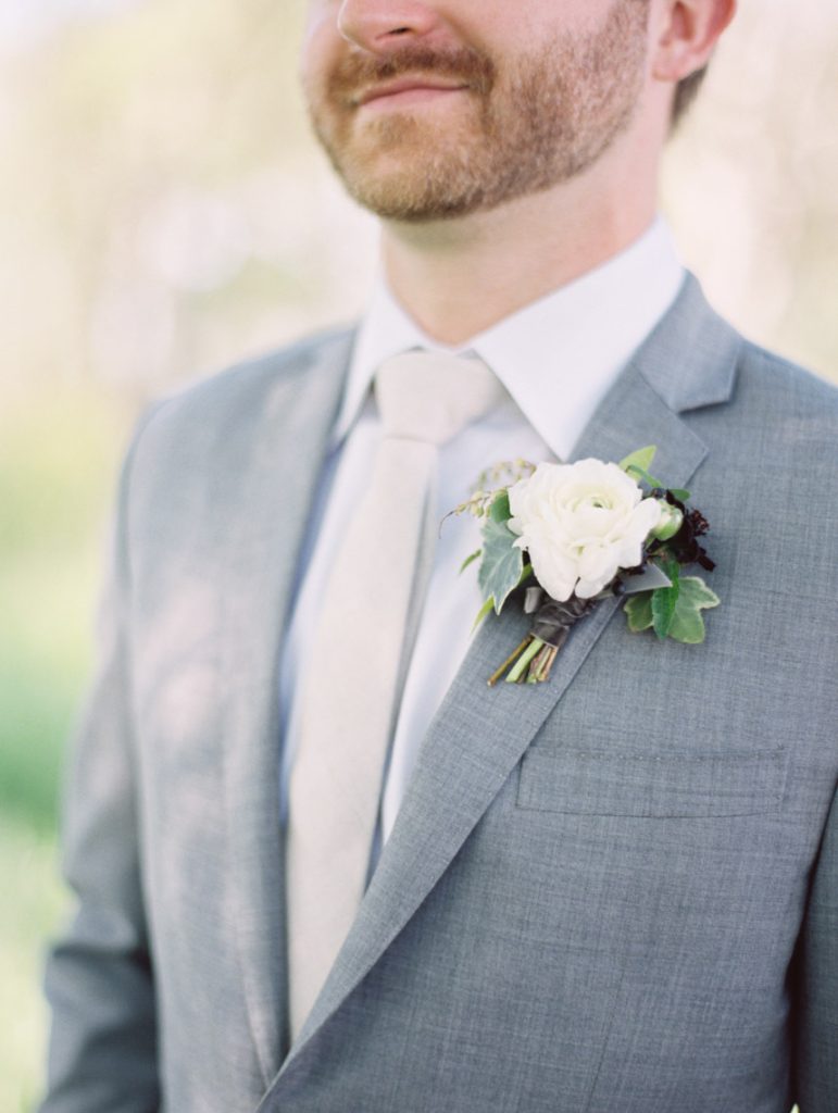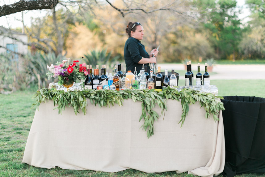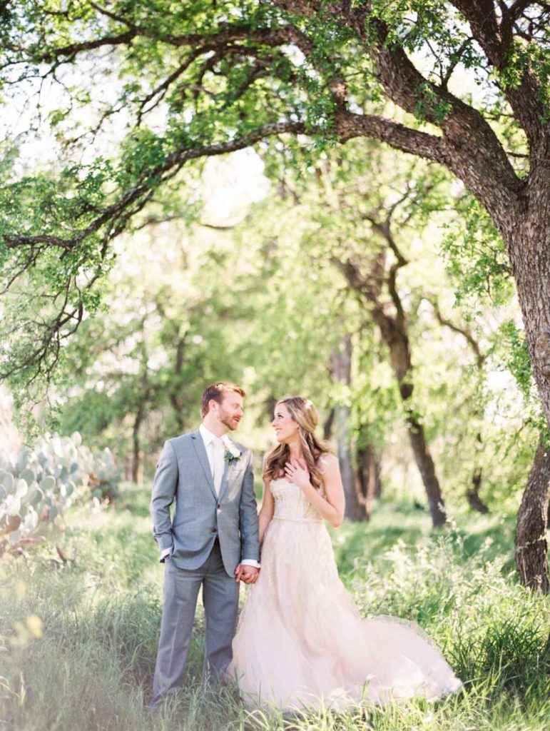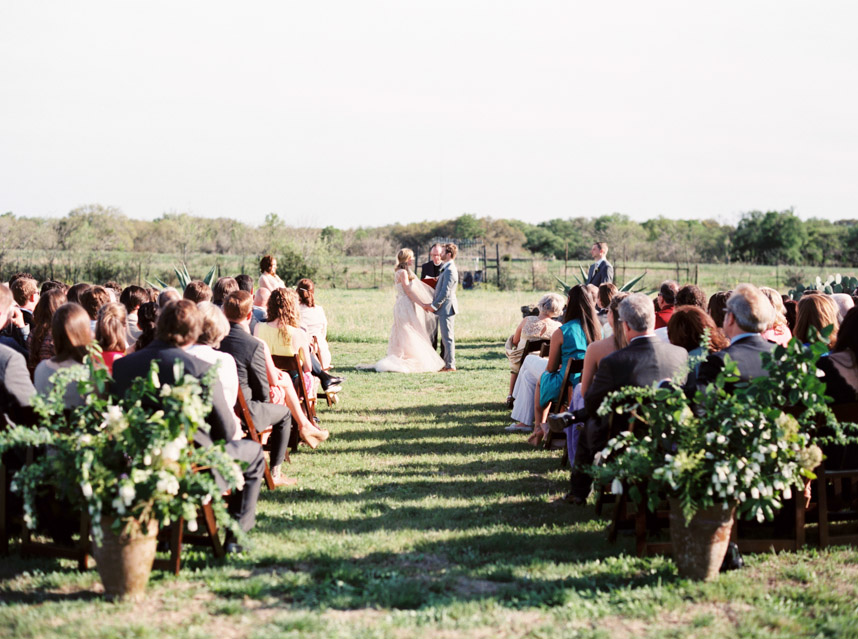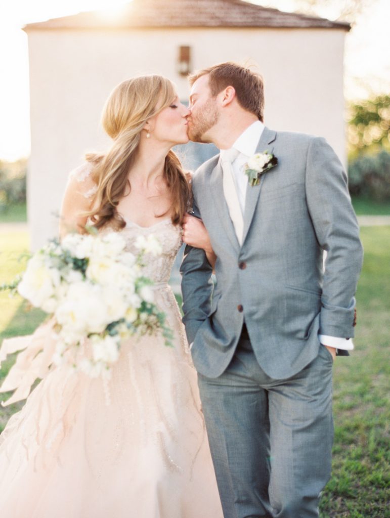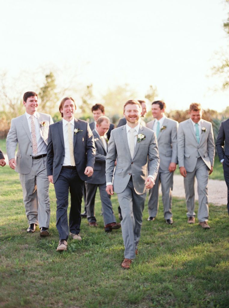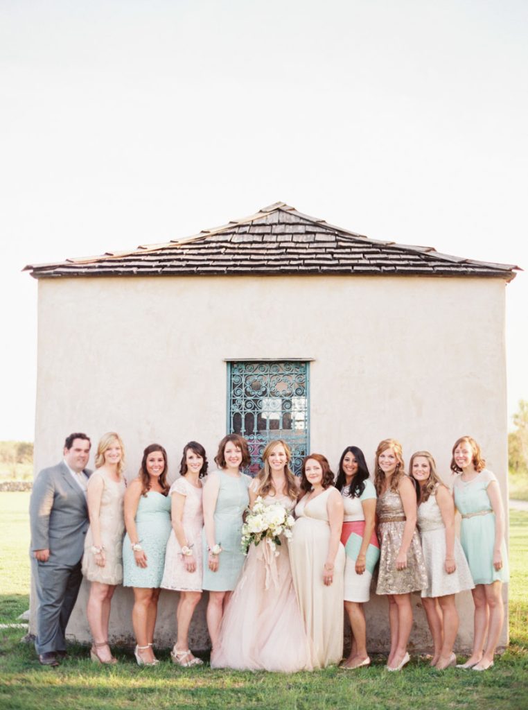 The couple knew they were running a risk with the weather for their March 2014 nuptials, but Mother Nature was looking out for them the day of the wedding. The temperature was in the mid-70s, and Le San Michele was as breathtaking as ever with its prickly pear cactus plants, agave, and spire trees. Spring pastels from the palest pink to a more brilliant rouge pink popped against a background of greenery. At 5 o’clock, about 175 friends and family filled the rows of chairs as the central Texas wind made the greenery sway at the garden party. Handkerchief programs were on each chair, and Texas wildflowers could be seen blooming all around the ceremony site. The groomsmen wore grey suits, and the bridesmaids wore knee-length gowns in their choice of style.