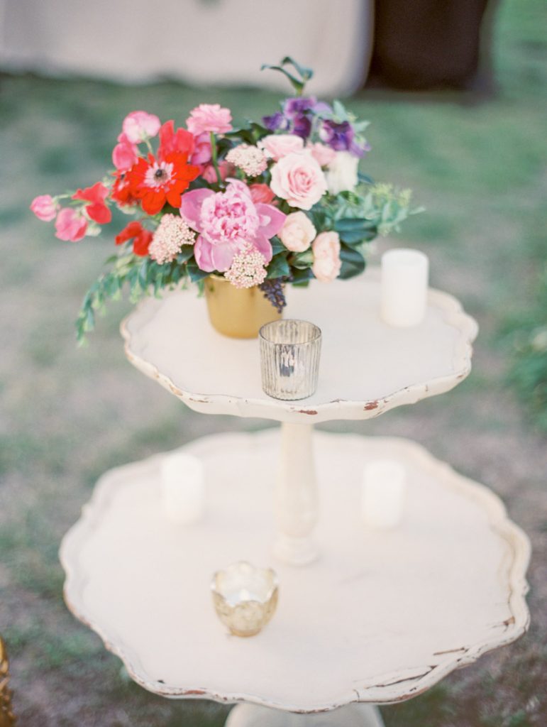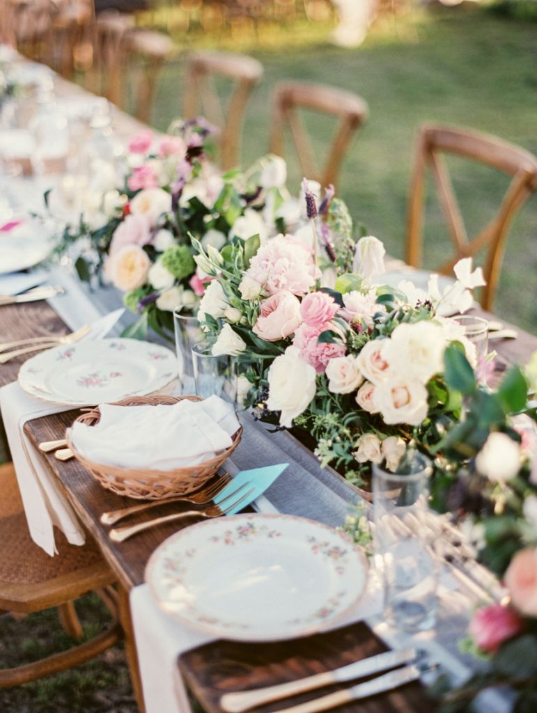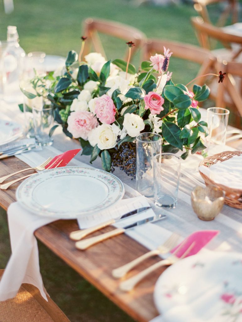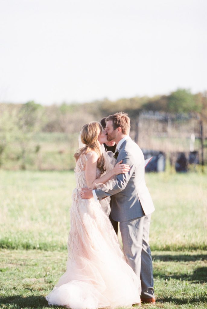 Escorted down the aisle by her father, Paige was stunning in her tulle Monique Lhuillier gown with full skirt and delicate appliqués in the palest pink. Their ceremony was relatively short with traditional vows and poems read by their friends. The same pastor that performed Paige’s sister’s ceremony also married them. “There was even more land beyond the stone wall, behind Pastor Craig, so for the first part of the ceremony it felt like it was just us standing in the middle of the field. It was so calming and intimate,” Blair says. After the minister pronounced them husband and wife, Chris kissed his bride, and they led the way to the reception with beaming smiles across their faces.