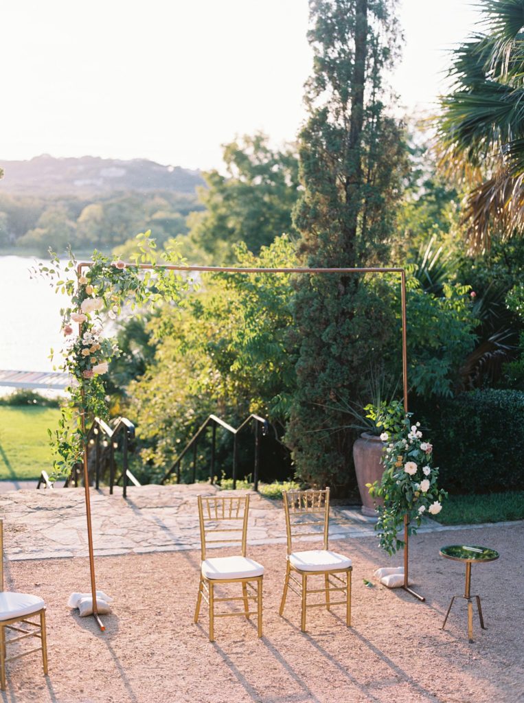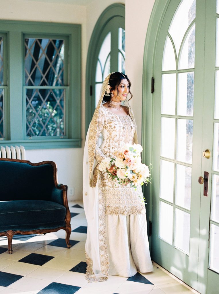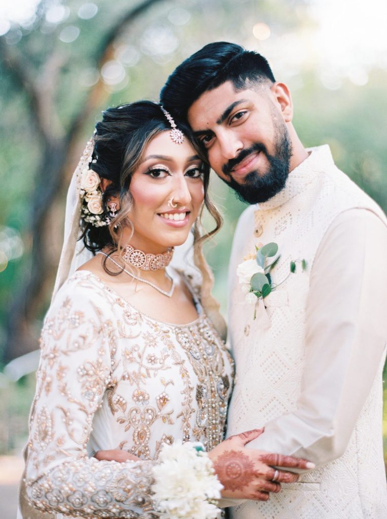 Zarin and Fahad were wed in the most stunning South Asian wedding at The Contemporary Austin – Laguna Gloria. The Bangladeshi/Pakistani couple celebrated the rites of marriage with a traditional Nikkah ceremony in a champagne, peach and white palette, with the Colorado River glistening behind as their sunset backdrop. The ceremony was the perfect fusion of South Asian and American tradition – in fact, bride Zarin says, “The Nikkah bride typically doesn’t walk down the aisle, but I made sure to incorporate that into my day to mirror my experience being a Bangladeshi woman growing up in the United States.” She wore the most stunning champagne and white Nikkah dress that was beautifully complemented by her soft pastel bouquet. Whim Hospitality and Loot Rentals set the scene for the ceremony and reception with a gold altar arch, gold Chiavari chairs and white linens, while Crave Catering created a tasty spread for their guests. After scrolling through their photos featuring Zarin’s gorgeous champagne and white Nikkah dress, you absolutely must watch the couple’s South Asian wedding highlight video captured by The Crakes, linked below! Cheers to the newlywed Mr. and Mrs. Raza!