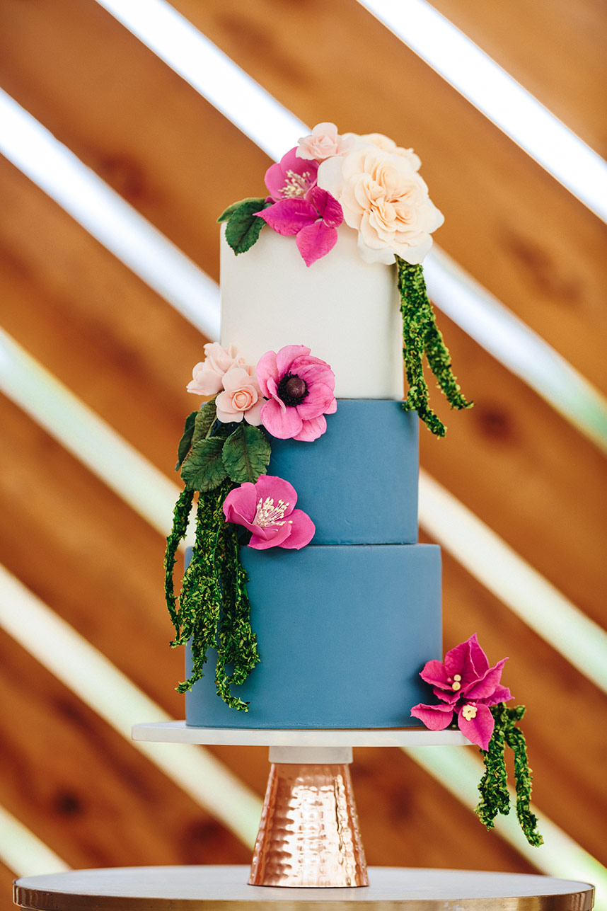We love the idea of incorporating floral garland into the wedding cake like this stunner from Blue Note Bakery.