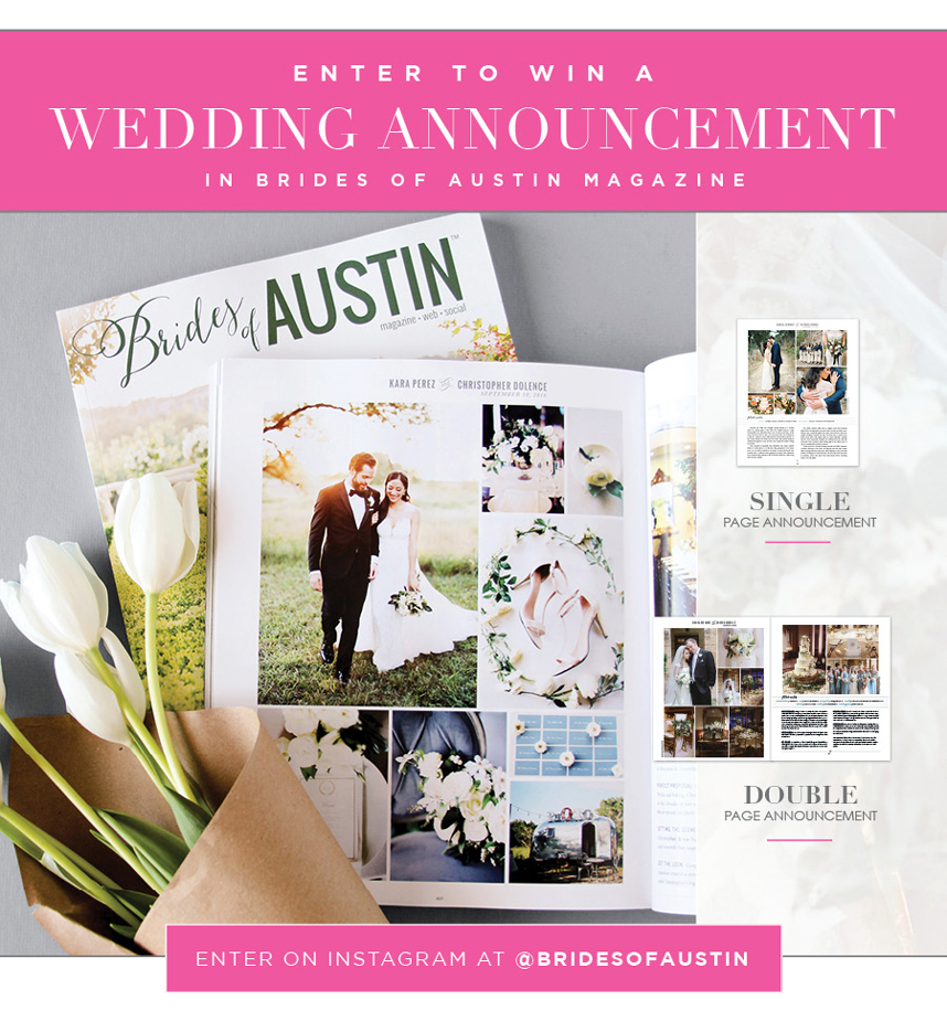 Happy Thursday! We have a special treat for all our darling brides! We are giving away a single page wedding announcement in the upcoming Fall/Winter 2017 issue of Brides of Austin to one lucky couple! Head over to Instagram to enter (@bridesofaustin). All you have to do for a chance to win is comment on the contest photo with your wedding date and tag one of your favorite vendors. Super easy! Get an extra entry by sharing your fave wedding photo with #loveboa. Giveaway ends one week from today on Thursday, June 8th, and winners will be announced then!