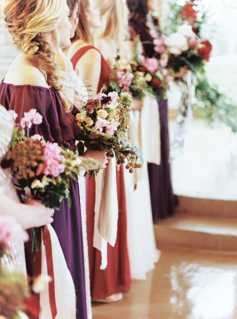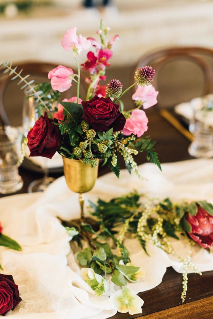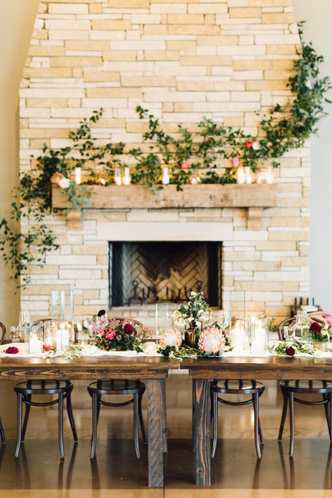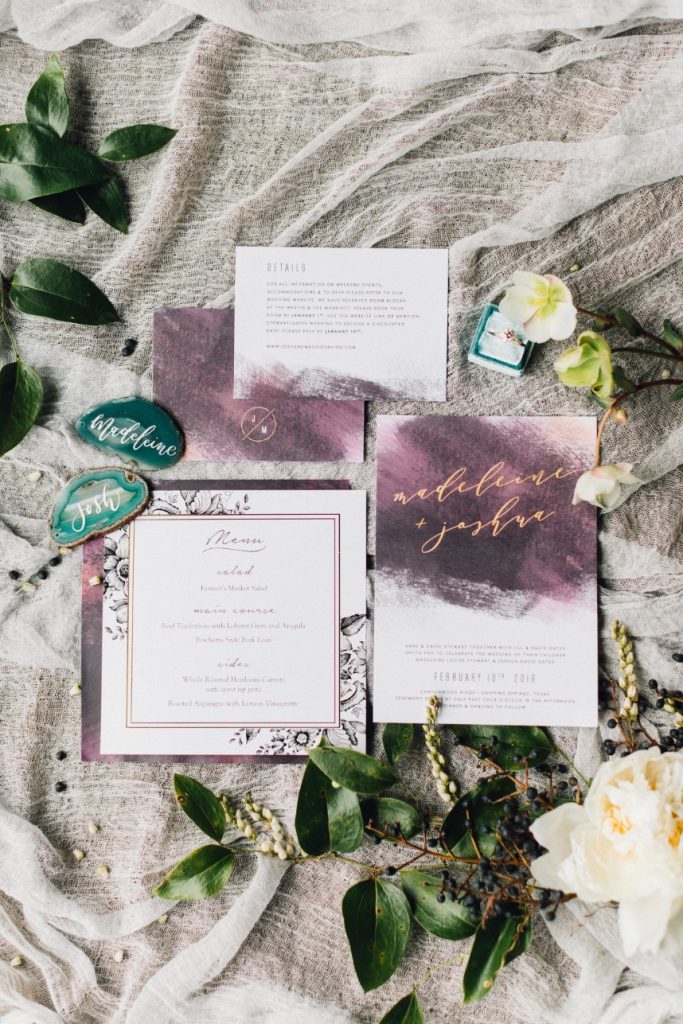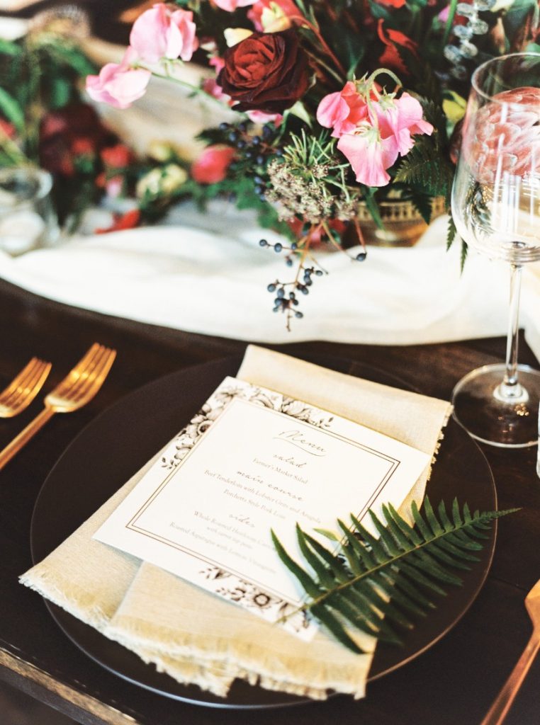 Winter is the perfect season for a wedding featuring gorgeous jewel tones and greenery with pops of copper!  At Maddie and Josh’s reception, guests gathered around wooden farm tables and enjoyed a delicious family style meal catered by Royal Fig Catering with a seasonal farmer’s market salad to start, followed by beef tenderloin with lobster grits and arugula, porchetta style pork loin, roaster heirloom carrots with pesto and roasted asparagus with a lemon vinaigrette – yum! Be sure to scroll down and catch their heartwarming wedding video by Honey Gem Creative! Cheers to Madeleine and Joshua and their seasonal soiree!