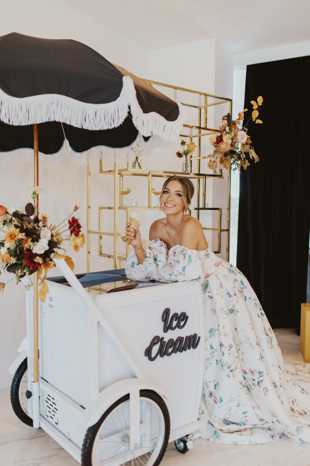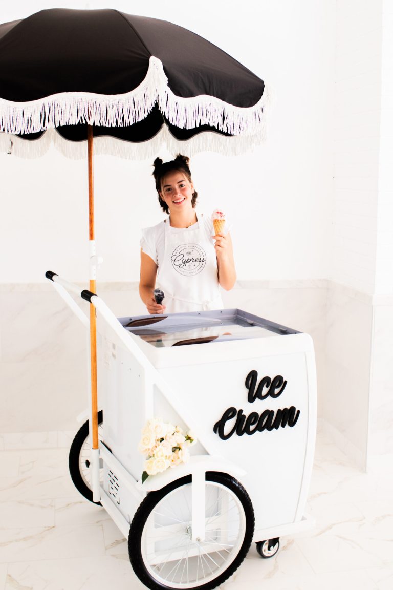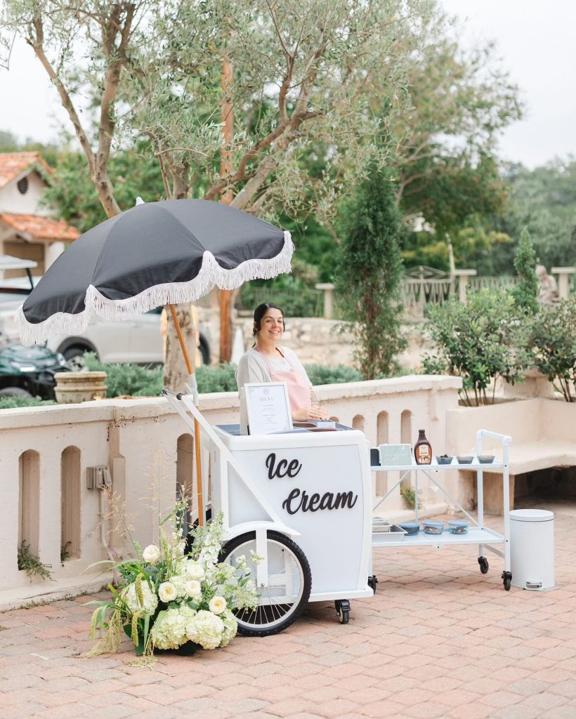 Full Service Ice Cream Cart Rental | Our elegant ice cream cart is the perfect addition to your big day or event. Choose from over 20 flavors of ice cream and let our friendly server dish out the sweets.