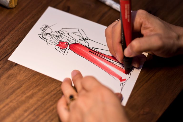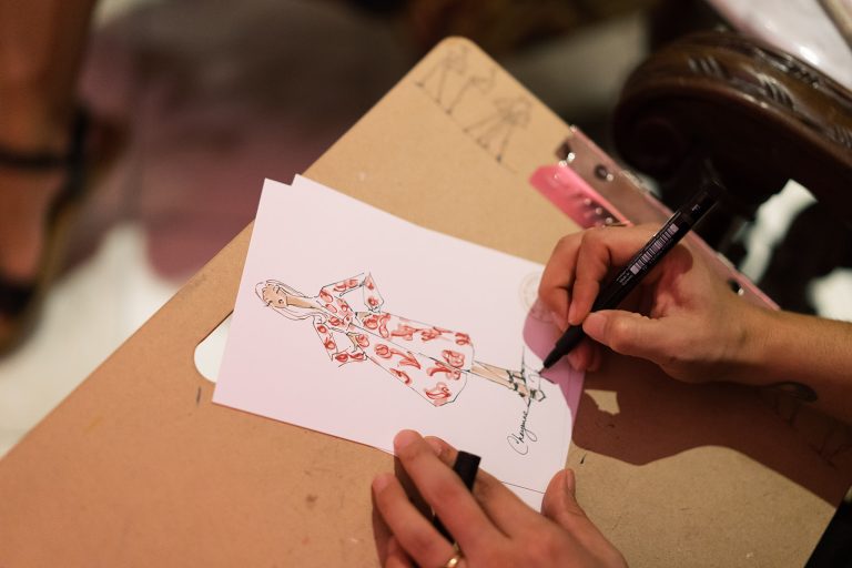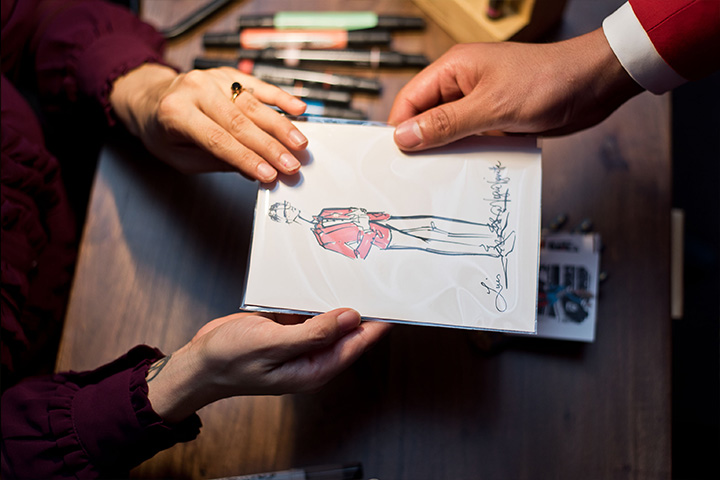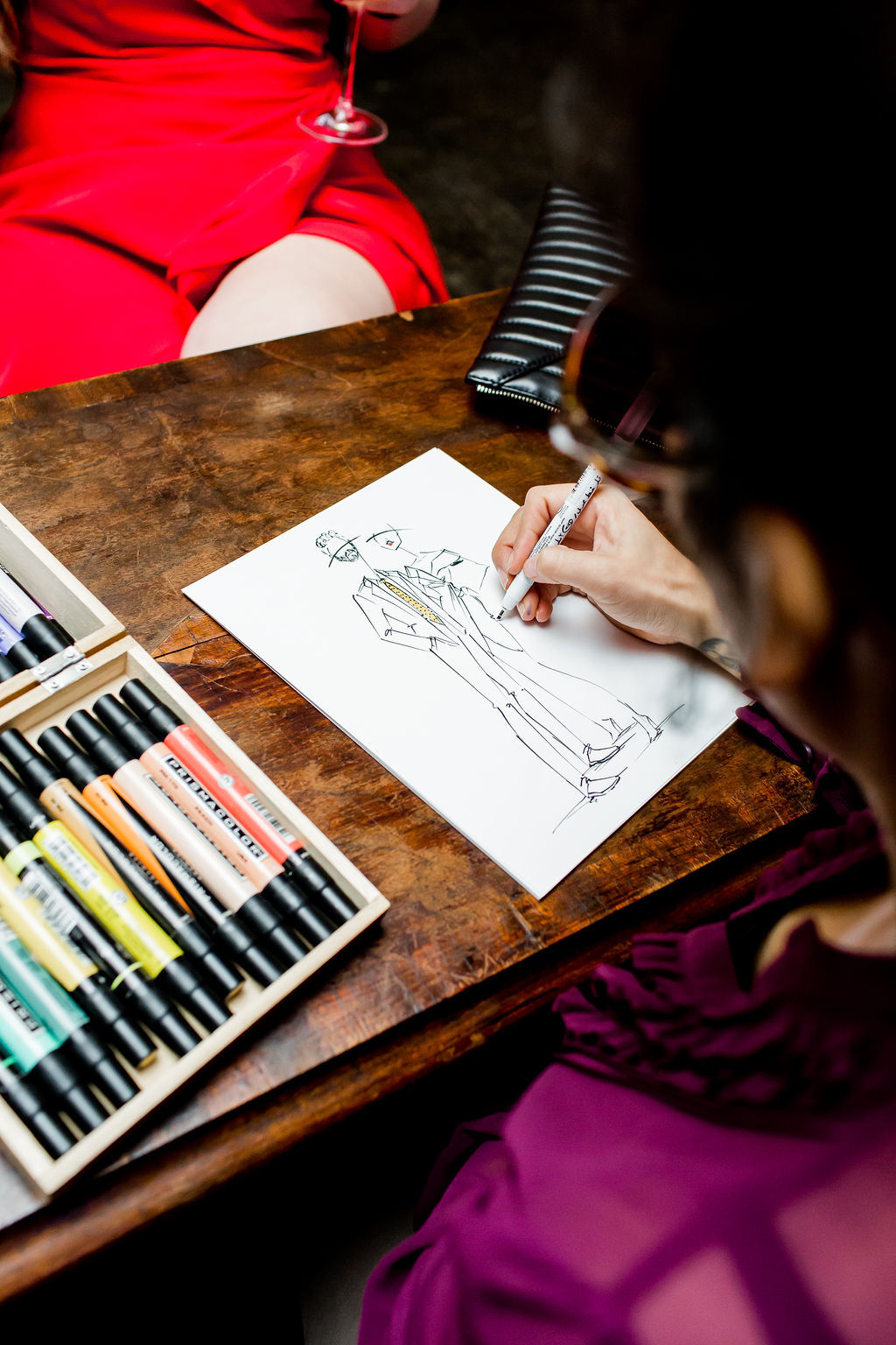 Vogue Vignette provides the ultimate art experience and wedding keepsake for your closest family and friends. While guests celebrate, laugh together and share in the momentous occasion, a Vogue Vignette artist swiftly captures their spirit and style in a high fashion illustration. Guests get to watch the process of art happening before their eyes and take home their personalized keepsake to remind them of your wedding day.